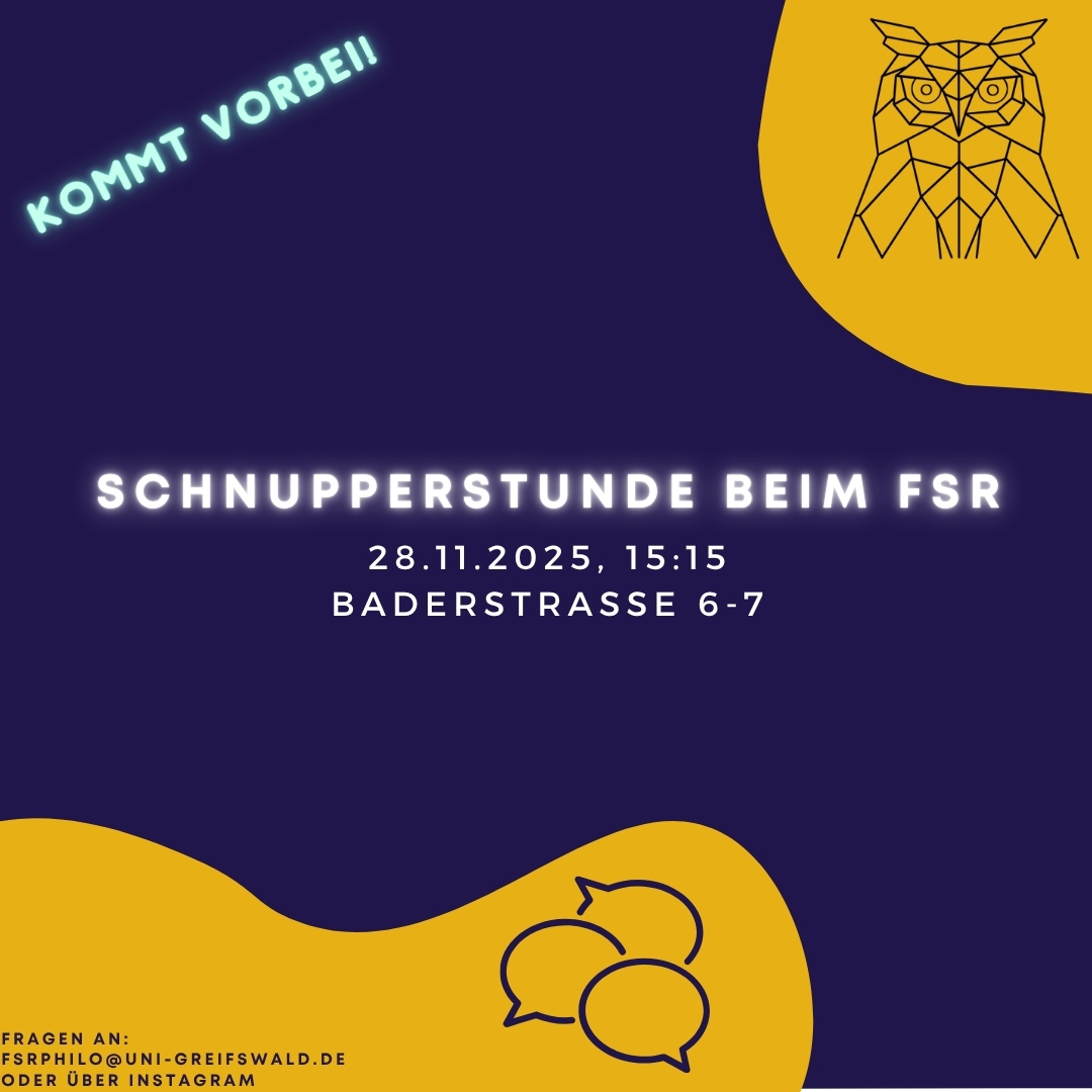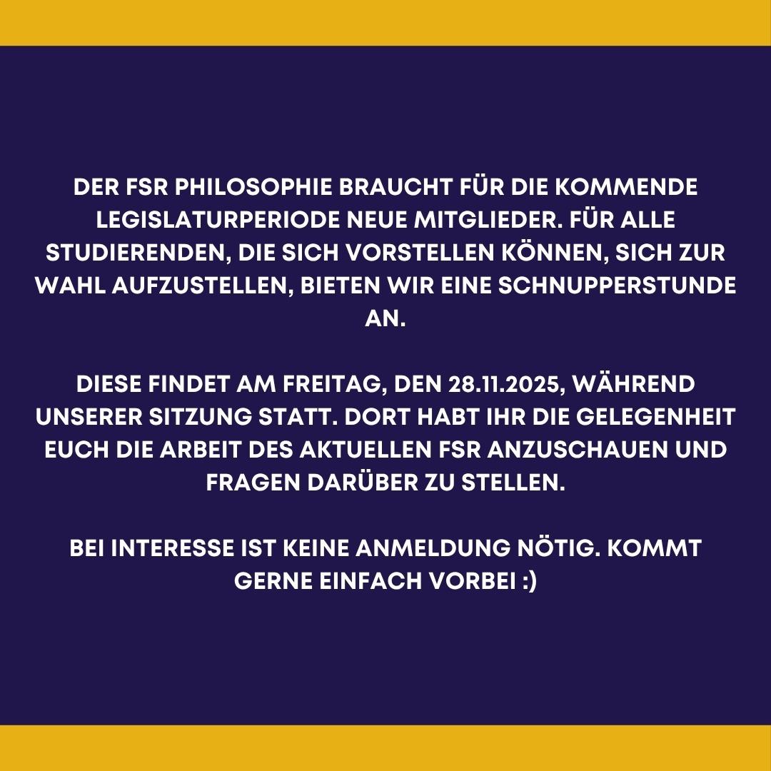 Der FSR Philosophie sucht für die kommende Legislaturperiode neue Mitglieder. Wir bieten nächsten Freitag (28.11.2025) um 15:15 Uhr eine Schnupperstunde für Studierende an, die sich vorstellen können als neue Mitglieder zu kandidieren.