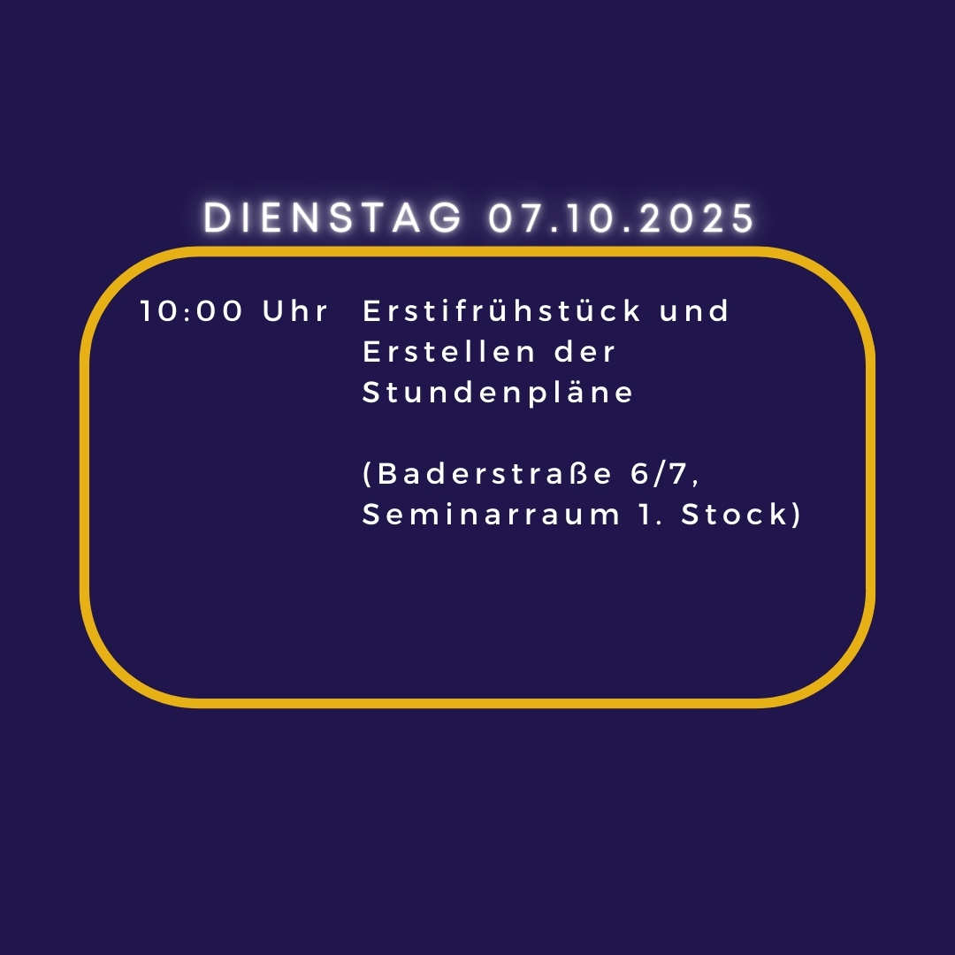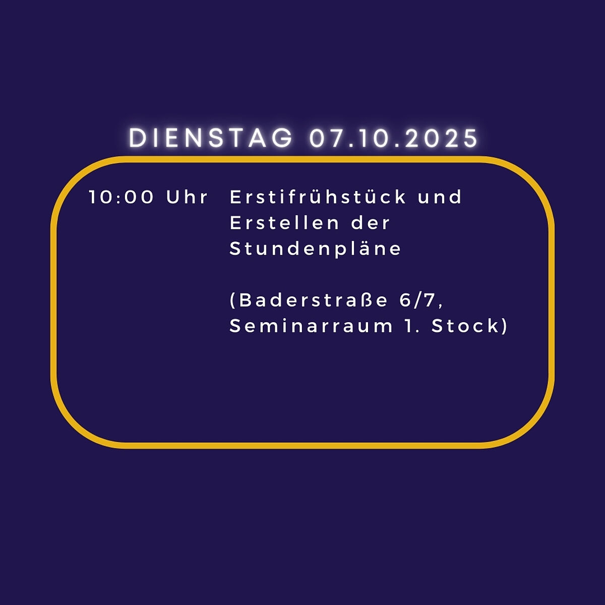 Am Dienstag, den 07.10., laden wir euch herzlich zu unserem Erstifrühstück im Seminarraum 1 in der Baderstraße 6-7 ein. Dort erklären wir auch das Erstellen der Stundenpläne