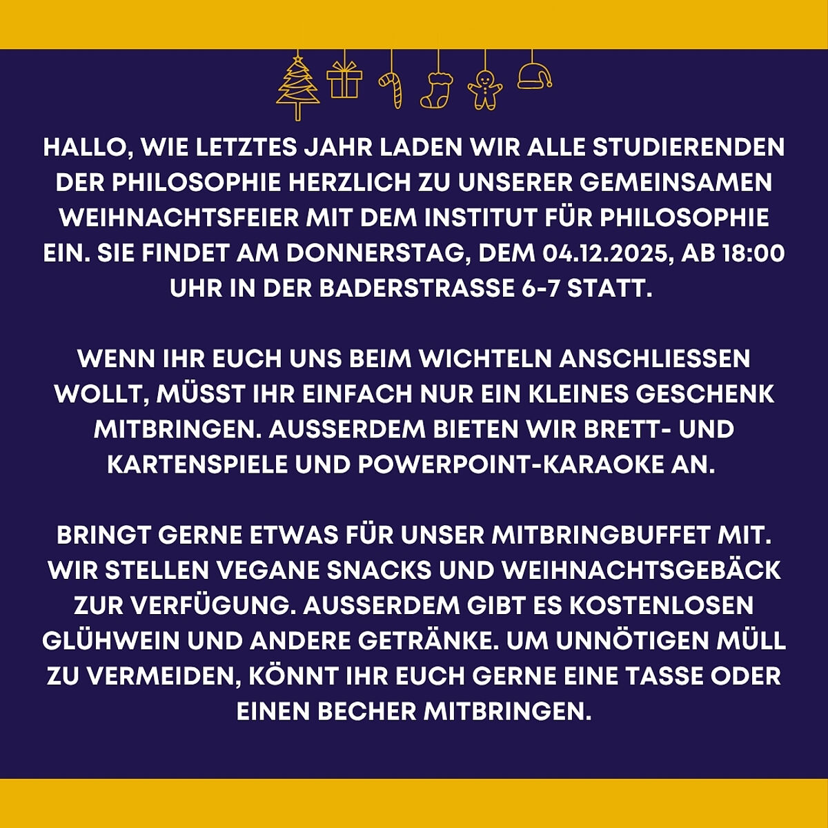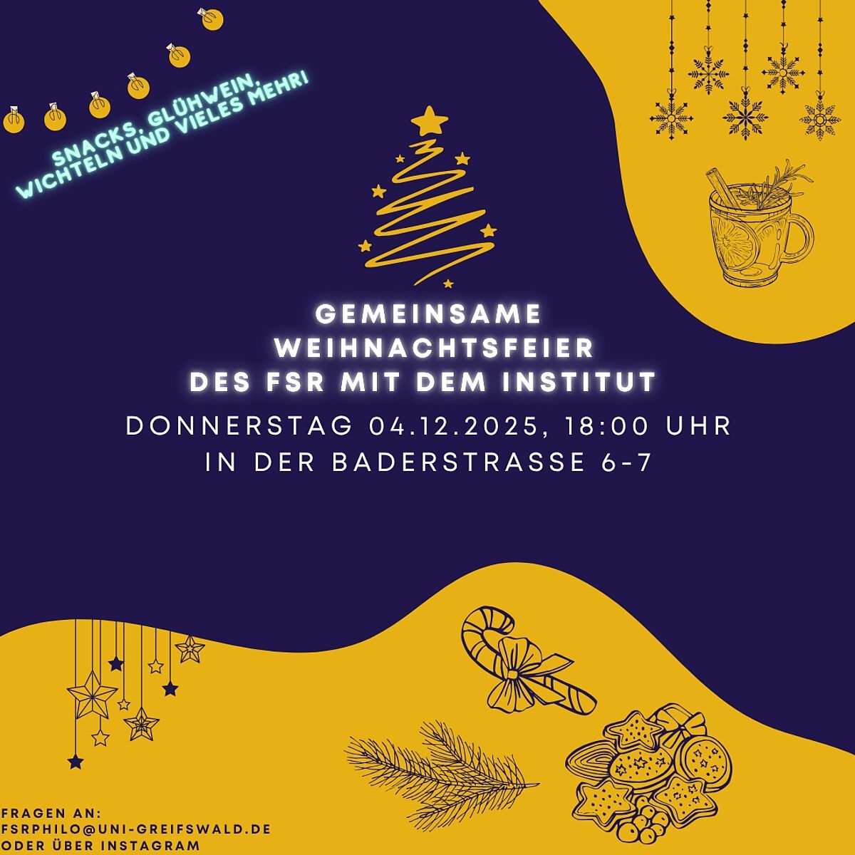 Am Freitag, den 28.11.2025, treffen wir uns um 16:00 Uhr vor dem Institutsgebäude in der Baderstraße 6-7, um gemeinsam zum Weihnachtsmarkt zu gehen. Kommt gerne vorbei!